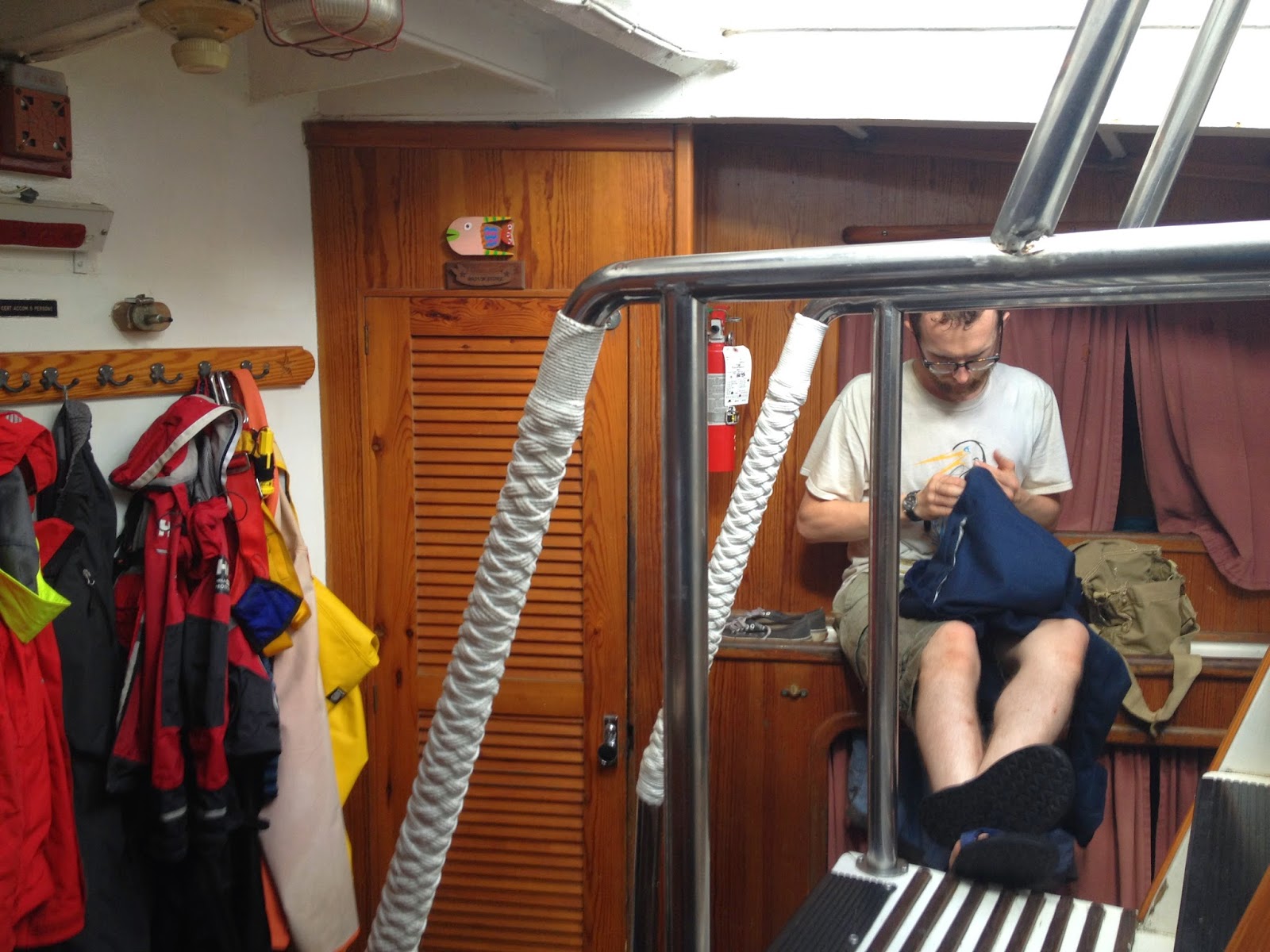 A selfie taken in a moment of rest in between shooting at the Gibson House. Between the lights, carpet, and insulating wallpaper, it was a very hot stairway.