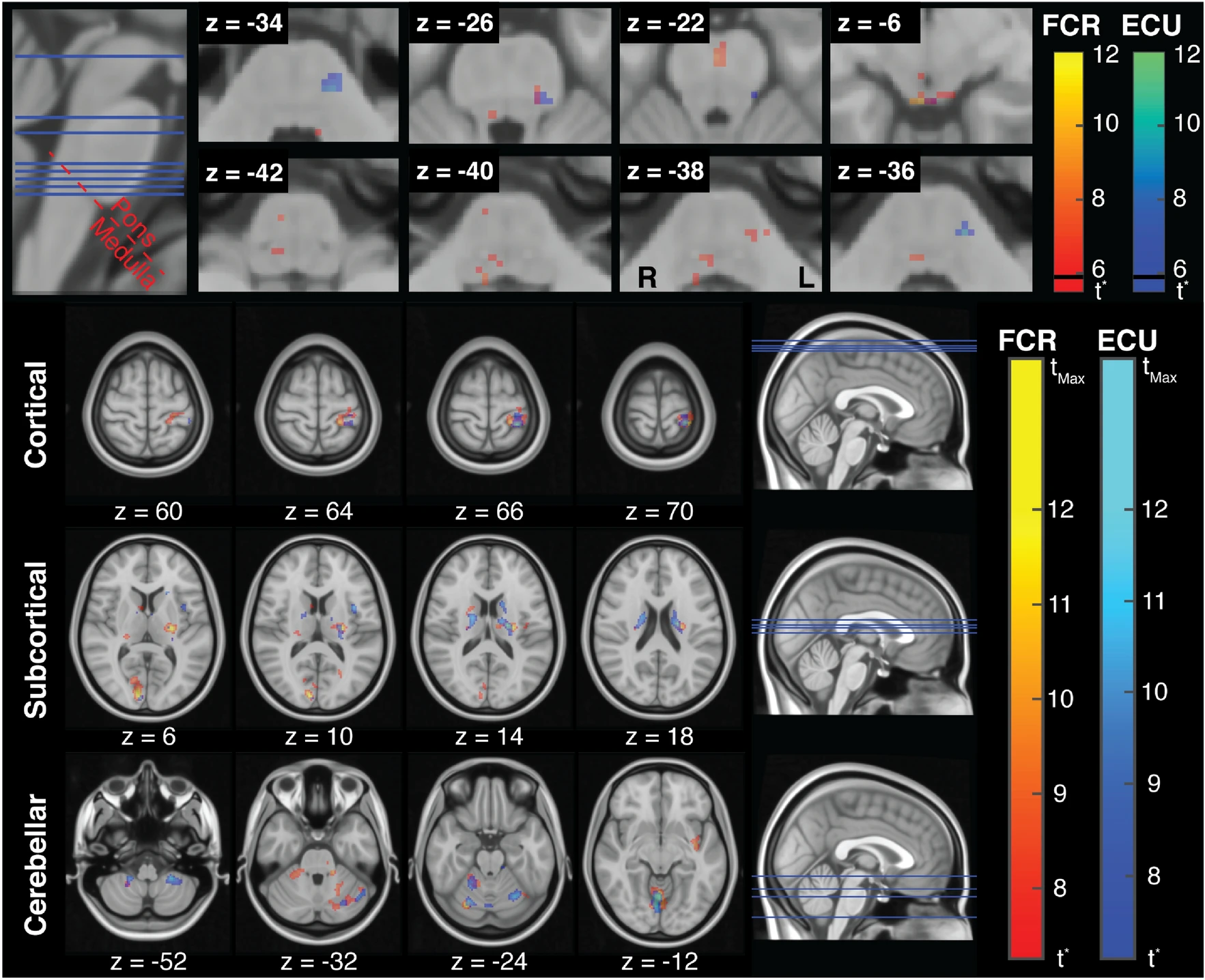 (above) Muscle specific organization of stretch-related activity in the brainstem. Stretch-related activity in the cortical, subcortical, and cerebellar brain regions associated with FCR and ECU activity.