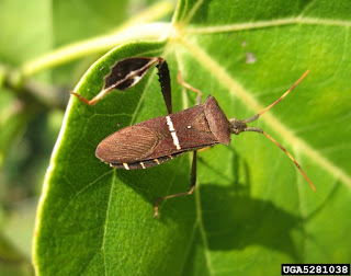 Leaf-footed bug, one hind leg is missing. The existing hind leg has the typical leaf-like projections. Photo provided by: Dan Clark, USDI National Park Service, Bugwood.org.