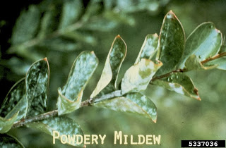 Powdery mildew on crape myrtle. Photo provided by: Robert Lambe, Virginia Polytechnic Institute and State University, Bugwood.org