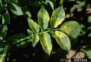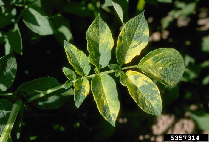 Alfalfa mosaic virus on potato. Photo provided by: Howard F. Schwartz, Colorado State University, Bugwood.org