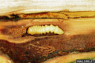 Asian longhorned beetle larva in feeding gallery. Photo provided by: Steven Katovich, USDA Forest Service, Bugwood.org