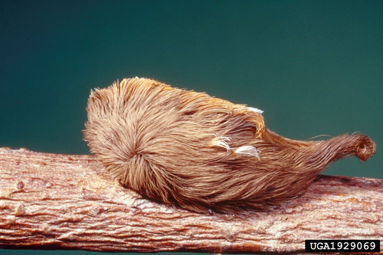 White-marked tussock moth –caterpillar stage (immature). These hairs do not sting. Photo provided by: Brian Kunkel, Ornamentals IPM Specialist, University of Delaware