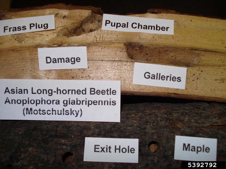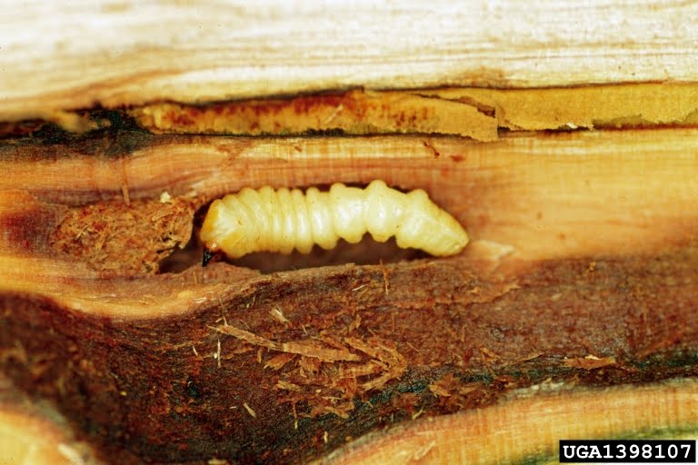 Asian longhorned beetle larva in feeding gallery. Photo provided by: Steven Katovich, USDA Forest Service, Bugwood.org