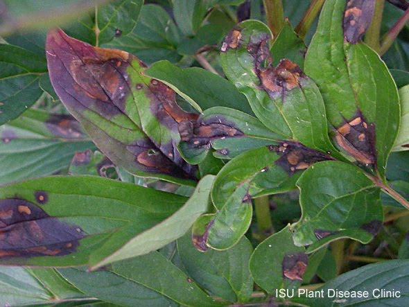 Peony leaf blotch. Photo found at: http://www.plantpath.iastate.edu/pdc/node/137