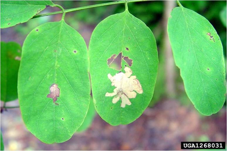 Locust leafminer damage. Photo provided by: John A. Weidhass, Virginia Polytechnic Institute and State University, Bugwood.org