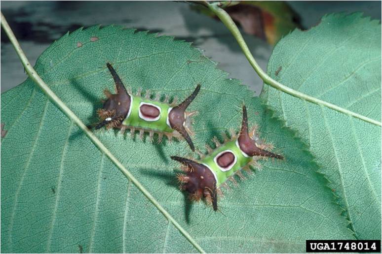 Saddleback caterpillars. These have stinging hairs. Photo provided by: Robert L. Anderson, USDA Forest Service, Bugwood.org